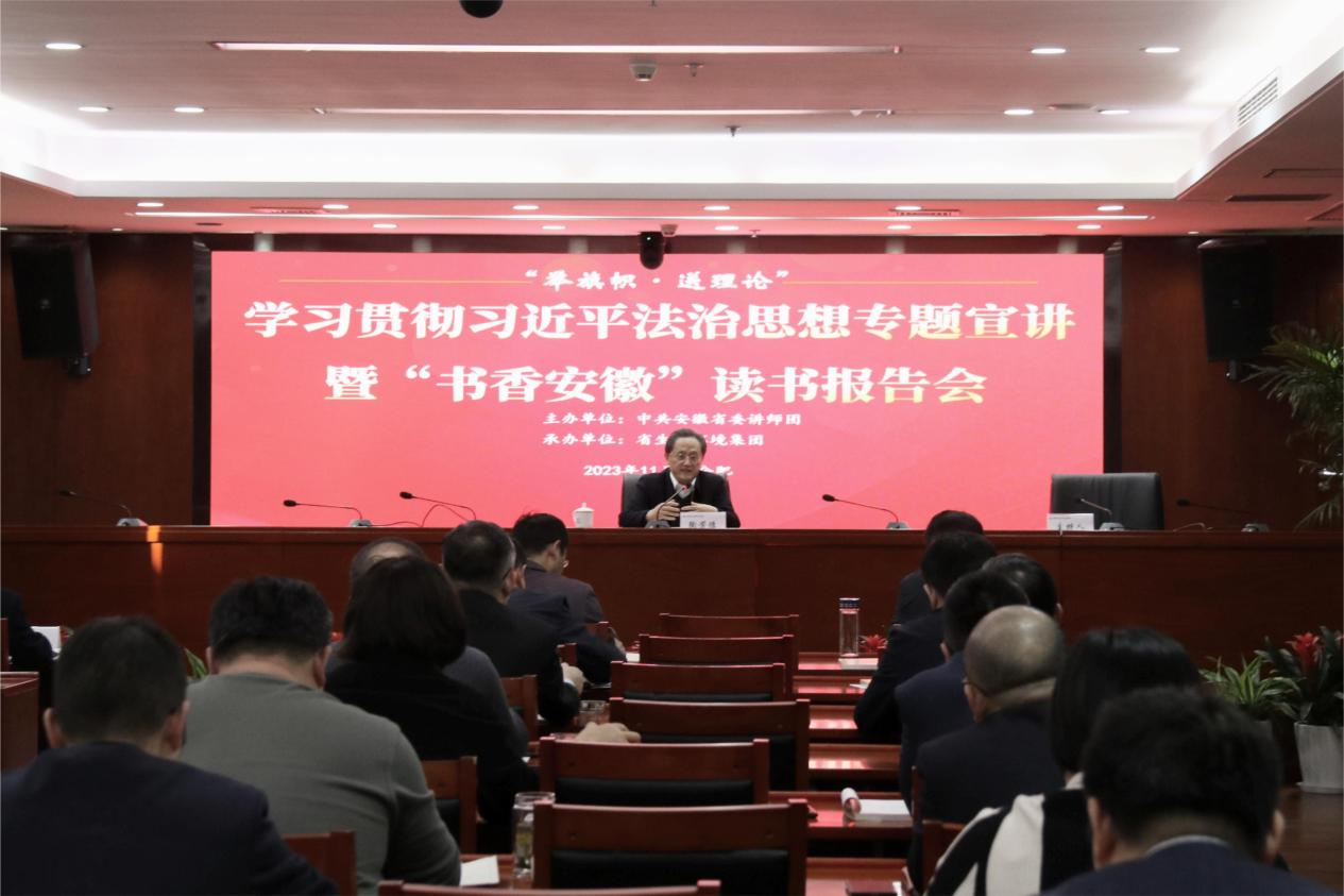 11月23日下午,省委講師團(tuán)“舉旗幟·送理論”學(xué)習(xí)貫徹習(xí)近平法治思想專題宣講暨“書香安徽”讀書報(bào)告會(huì)走進(jìn)省生態(tài)環(huán)境集團(tuán)。報(bào)告會(huì)邀請省人民檢察院黨組成員、副檢察長、一級(jí)高級(jí)檢察官陶芳德作專題宣講報(bào)告。集團(tuán)公司黨委及經(jīng)營班子成員,各直屬(控股)公司主要負(fù)責(zé)人、法務(wù)合規(guī)工作分管領(lǐng)導(dǎo)及部門負(fù)責(zé)人,集團(tuán)本部中層及以上管理人員參加報(bào)告會(huì)。