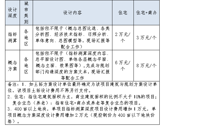 1.土拓方案設(shè)計費用為單價包干價,包括一切可能發(fā)生的費用,不同業(yè)態(tài)的土拓方案設(shè)計費如下表,參選人如中標(biāo),土拓方案設(shè)計費用按照下表執(zhí)行。