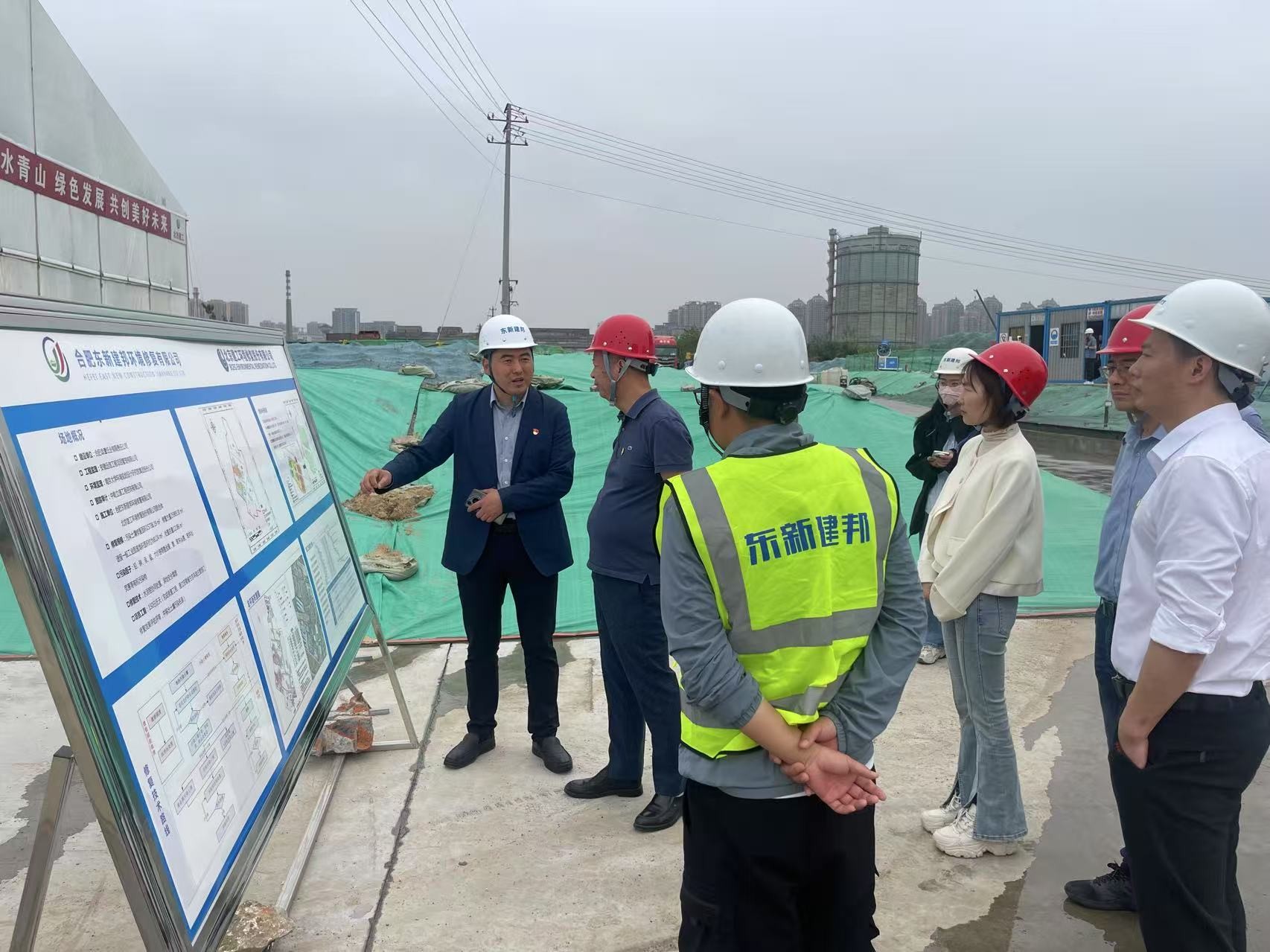 隨后,雙方深入到東新建邦環(huán)境修復公司承建的合肥造紙廠土壤修復項目現(xiàn)場。東新建邦環(huán)境修復公司副總經(jīng)理李泰平系統(tǒng)介紹了項目背景、修復技術(shù)方案、施工工藝以及目前推進過程中重難點問題與解決方案等。雙方圍繞項目施工管理、質(zhì)量控制、安全保障等方面展開深度研討和經(jīng)驗分享。