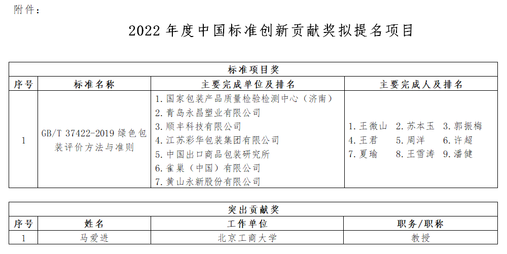 6月14日,中國(guó)包裝聯(lián)合會(huì)在其官網(wǎng)發(fā)布《關(guān)于2022年度中國(guó)標(biāo)準(zhǔn)創(chuàng)新貢獻(xiàn)獎(jiǎng)擬提名項(xiàng)目的公示》。