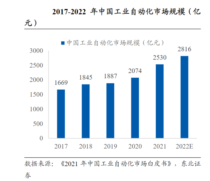 在變革的時代中,市場風云變化、技術(shù)的快速更迭都直接影響工業(yè)自動化的發(fā)展,尤其是隨著機器人、人工智能的升溫,工業(yè)自動化趨勢愈演愈烈,加上蓬勃發(fā)展的制造業(yè),雙輪驅(qū)動下為我國工業(yè)化市場提供了廣闊的發(fā)展空間。數(shù)據(jù)《中國工業(yè)自動化市場白皮書》顯示,2020年我國工業(yè)自動化市場規(guī)模2530億元,2022年約2816億元。