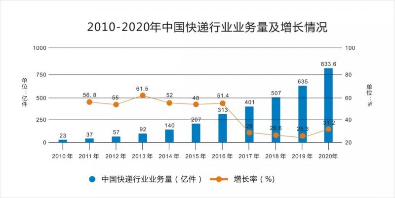 圖表:2010-2020年中國快遞業(yè)業(yè)務(wù)量及增長情況