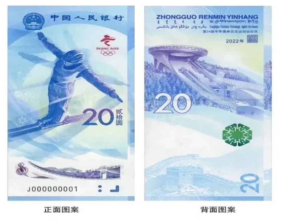 1.正面圖案:正面主景為花樣滑冰運動員圖案,上方為中華人民共和國國徽、“中國人民銀行”行名,左側(cè)為第24屆冬季奧林匹克運動會會徽,右側(cè)為光彩光變樂譜圖案、面額數(shù)字“20”與漢字“貳拾圓”,下方為動感全息圖案、透明視窗、盲文面額標記和冠字號碼。