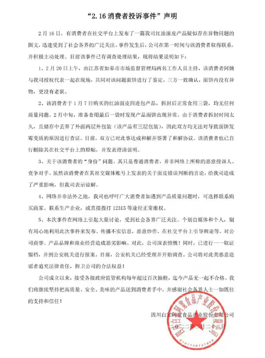 事情發(fā)生后,阿寬食品方面積極回應(yīng),并與該名消費者取得聯(lián)系。2月20日,在江蘇當(dāng)?shù)厥袌霰O(jiān)管部門兩名工作人員的主持下,消費者與阿寬食品公司代表現(xiàn)場拆封問題面餅,經(jīng)三方對當(dāng)場拆開的面皮進行確認,一致認可面餅內(nèi)沒有異物和老鼠。
