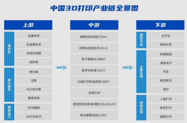 3D打印產(chǎn)業(yè)的上游包括原材料、核心硬件及3D掃描儀、3D打印軟件等;中游為各技術類型的3D打印設備,主流的三大技術為FLM、SLA、SLM;下游應用領域廣泛,覆蓋機械制造、消費電子、汽車行業(yè)、航空航天、醫(yī)療行業(yè)等。