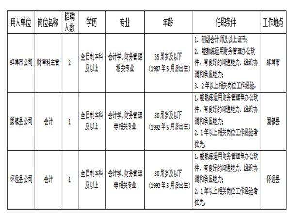 1、市公司財(cái)審主管:男女不限,全日制本科及以上學(xué)歷,年齡35周歲及以下,會計(jì)學(xué)、財(cái)務(wù)管理相關(guān)專業(yè);初級會計(jì)師及以上證書,熟練運(yùn)用財(cái)務(wù)管理辦公軟件,有良好的溝通能力、組織協(xié)調(diào)和承壓能力;2年以上相關(guān)崗位工作經(jīng)驗(yàn)。