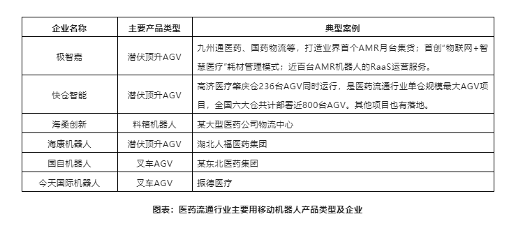 疫情以前,醫(yī)藥流通行業(yè)逐漸成為AGV/AMR應用的主要領域,在醫(yī)藥流通行業(yè),目前主要以類KIVA式倉儲機器人及箱式倉儲機器人應用為主,代表企業(yè)有極智嘉、快倉智能、海柔創(chuàng)新等,2021年這些企業(yè)都在醫(yī)藥流通行業(yè)取得了較大突破。
