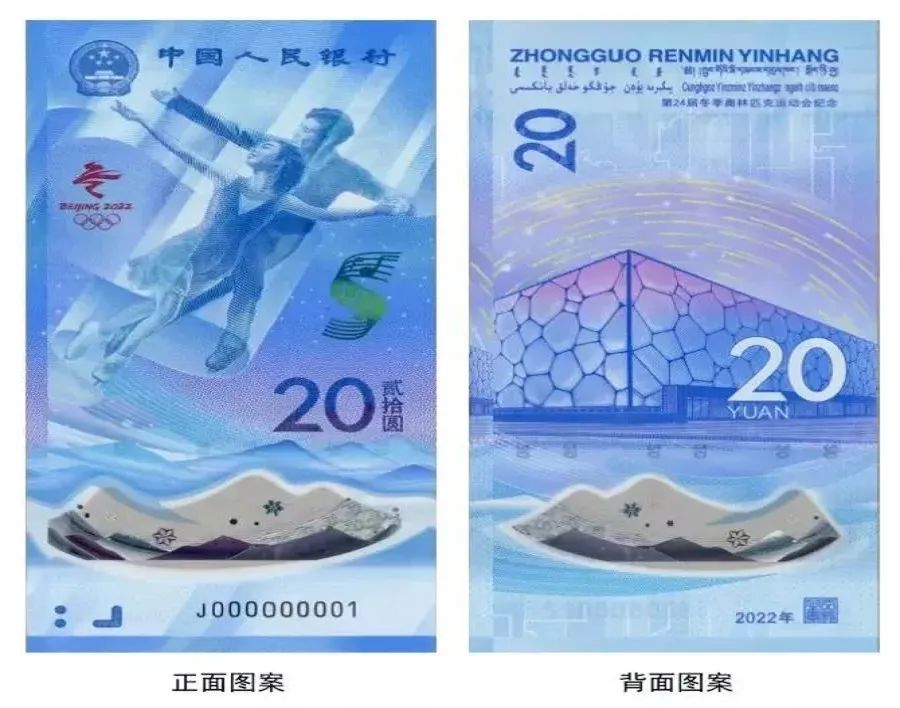 1.正面圖案:正面主景為花樣滑冰運動員圖案,上方為中華人民共和國國徽、“中國人民銀行”行名,左側(cè)為第24屆冬季奧林匹克運動會會徽,右側(cè)為光彩光變樂譜圖案、面額數(shù)字“20”與漢字“貳拾圓”,下方為動感全息圖案、透明視窗、盲文面額標記和冠字號碼。