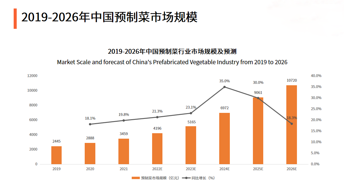 據(jù)艾媒咨詢數(shù)據(jù)顯示,2021年中國(guó)預(yù)制菜行業(yè)規(guī)模為3459億元,進(jìn)入2022年,預(yù)制菜的市場(chǎng)發(fā)展更加勢(shì)如破竹,僅3月全國(guó)預(yù)制菜銷(xiāo)售額同比增長(zhǎng)超100%,疫情形勢(shì)最為嚴(yán)峻的上海地區(qū)近半個(gè)月的同比增幅超過(guò)250%,預(yù)計(jì)2026年預(yù)制菜市場(chǎng)規(guī)模將達(dá)10720億元,預(yù)制菜行業(yè)正成為可以預(yù)見(jiàn)的下一個(gè)萬(wàn)億市場(chǎng)。